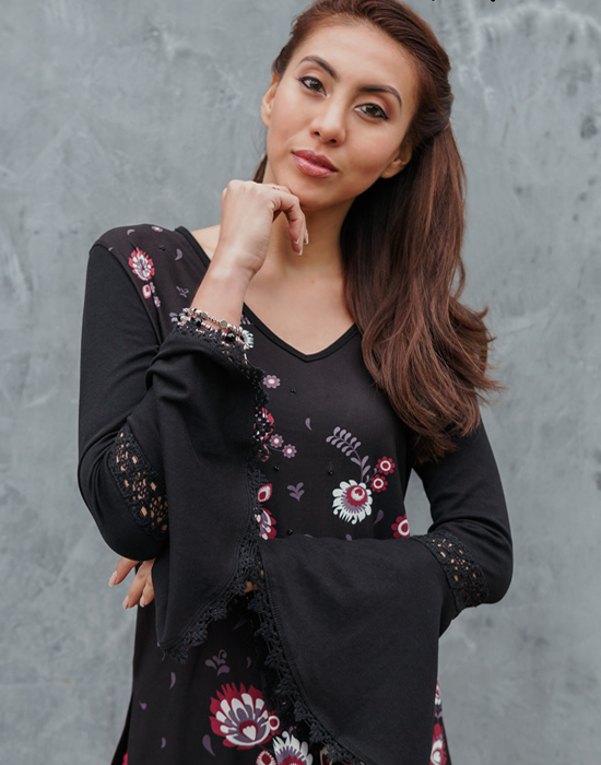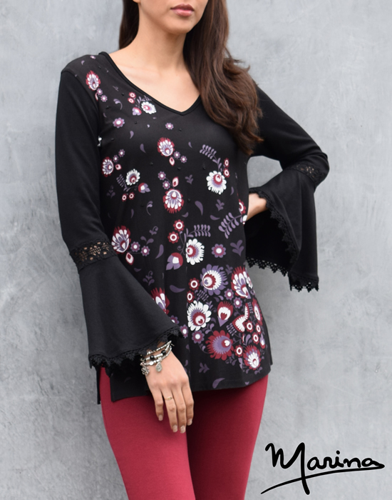 Luciras elegante y estilizada con este vestido de corte semi entallado (slim fit) con manga campana 3/4 aplicación de bolillo de algodón negro en la manga.